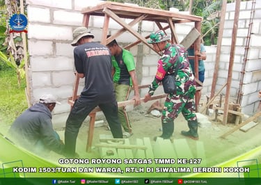 Personil Satgas TMMD bersama warga setempat bahu membahu mempercepat pembangunan Rumah Tidak Layak Huni, dengan focus utama adalah penuntasan penyusunan dinding menggunakan bata ringan, sabtu 28/02/26.